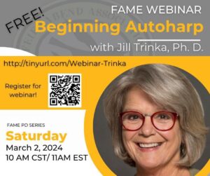 Dust off that Autoharp in your closet, tune it up, and settle in for a 90-minute Webinar in which you will be introduced to Jill’s version of the ABCs of playing the Chorded Zither, a.k.a. the Autoharp! We will address such topics as tuners and tuning, playing Appalachian style (upright) vs. table or laptop, picks, straps, strumming accompaniments and melody picking of familiar folk songs. You will gain the most out of this webinar if you attend with a tuned Autoharp and have a secure plastic thumb pick (Dunlop or Golden Gate) and two Dunlop metal fingerpicks (.025), which can be purchased at just about any music store that sells guitars. Come join the fun!