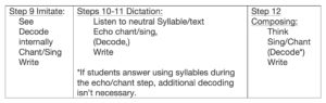 In Conversational Solfege (CS) the recommended amount of time spent in the Writing Steps (9-12) is significantly less than that spent developing conversational skills at Steps 2-5 (Conversational Solfege.)  After mastering the Reading Steps in a unit, it’s natural for students to want to move on to create through writing, and since CS places the conversational thinking of music before the composing step, children learn to imagine what they want first before trying to render it on paper.  Child Psychologist Jane Healy describes this same concept for language development.