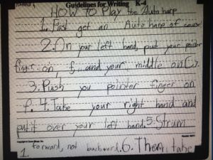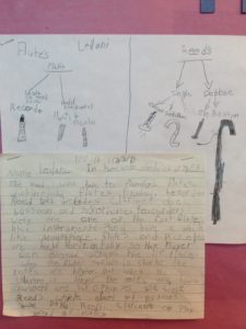 As students learn to play instruments (maracas, claves, guiro, djembes, tubanos, axatse, autoharp, violin, drums….) there should be an opportunity for them to create a booklet of the instruments with pictures and directions. At the end of the year they will have a wonderful booklet. As with the Listening Lessons Booklets, parents will be impressed with the breadth and richness of these experiences.