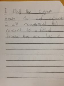 This could be of a concert attended, a piece performed in class, or one of their favorite pieces heard somewhere. This student filled out the graphic organizer then used it to write the essay. All the essays went on the bulletin board for all to read.