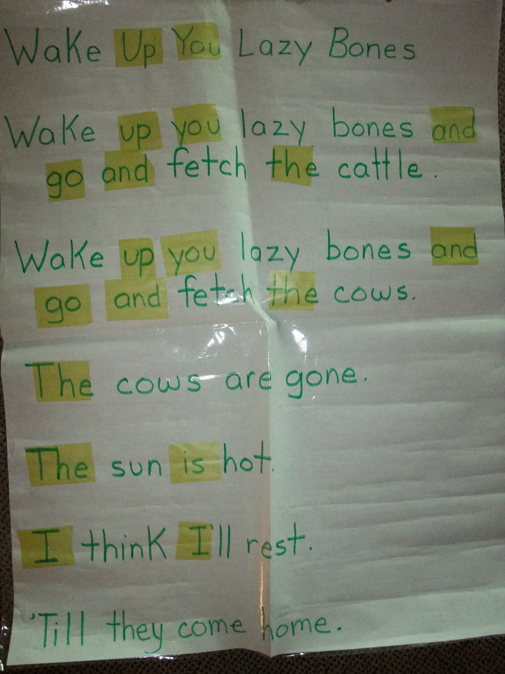 One day I walked into one of my kindergarten classes and saw the words to Wake Up You Lazy Bones on large chart paper, laminated, and on an easel. The students were playing “Detective,” trying to find all their Word Wall Words (those words that each grade level is responsible for knowing, using correctly and spelling correctly). And here was an Ask Me full of them! At that time, a third of their Word Wall Words were contained in Wake Up You Lazy Bones. The kindergarten teacher was reinforcing the Language Arts curriculum by using their Ask Me as the Morning Message. She had been keeping track of them and using those that were applicable to what she was teaching.