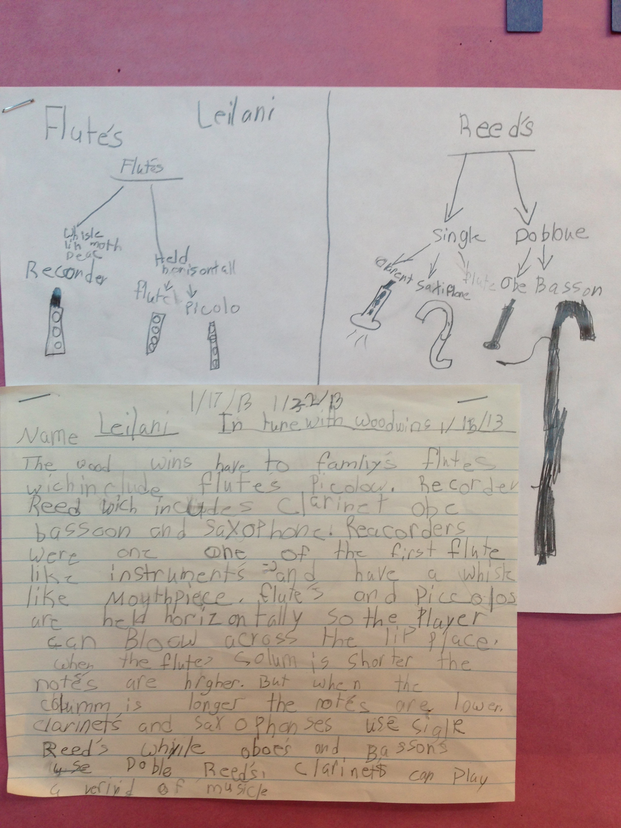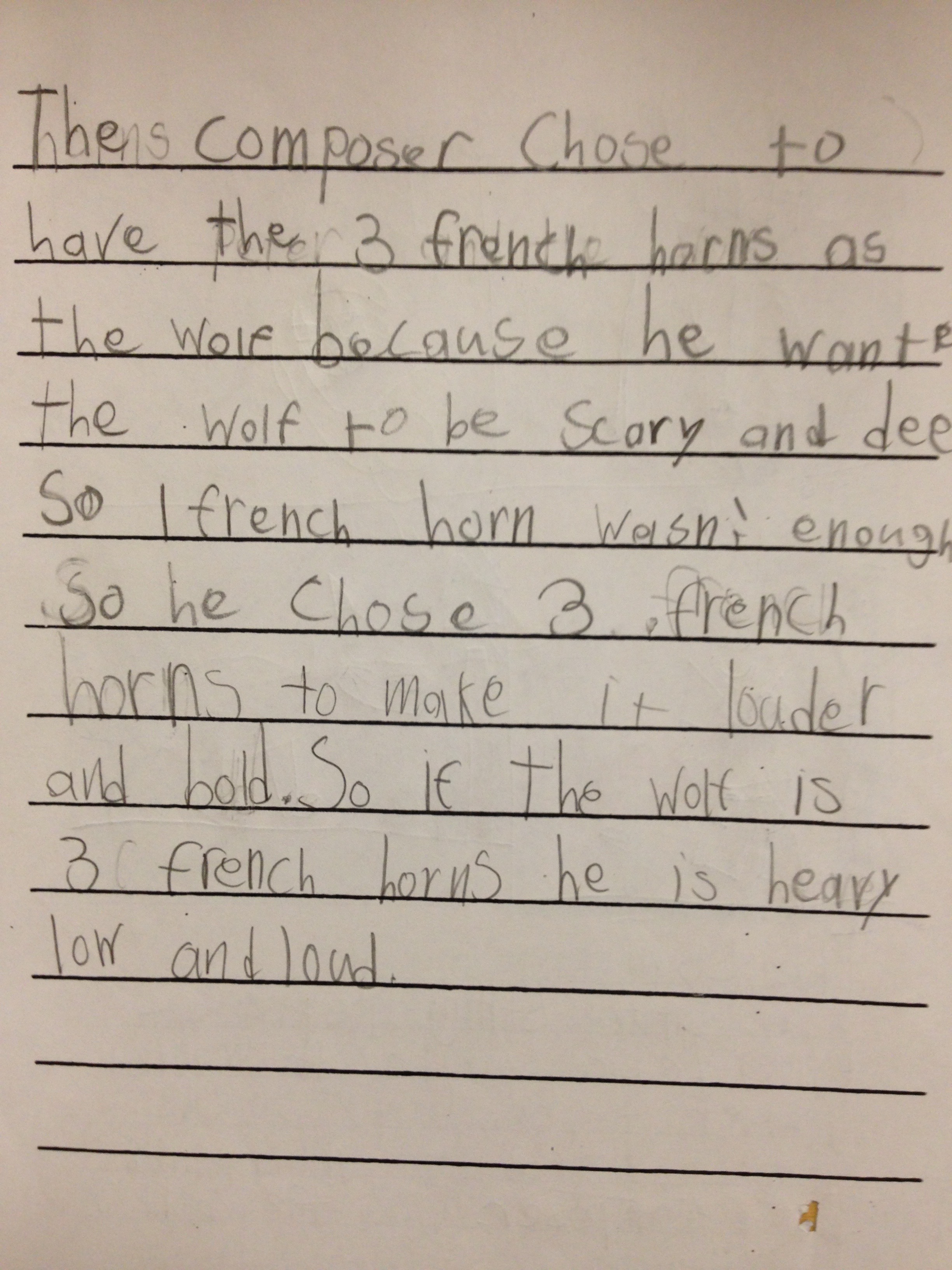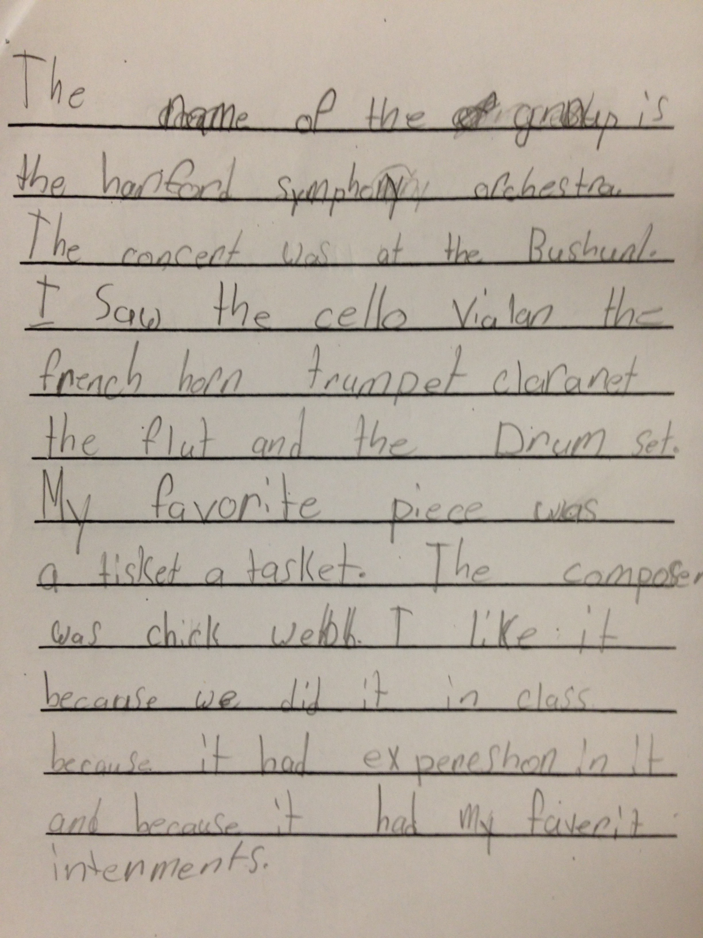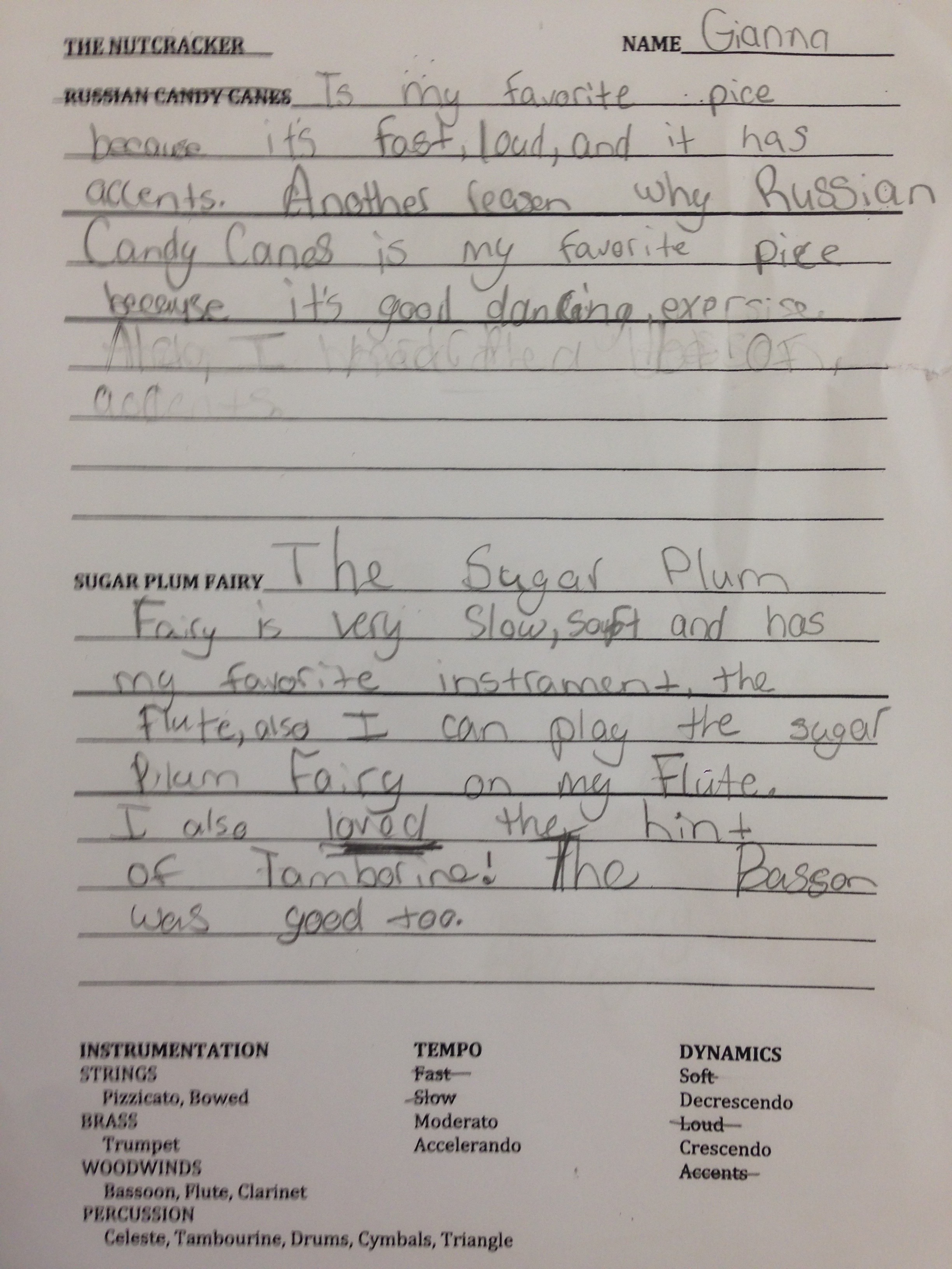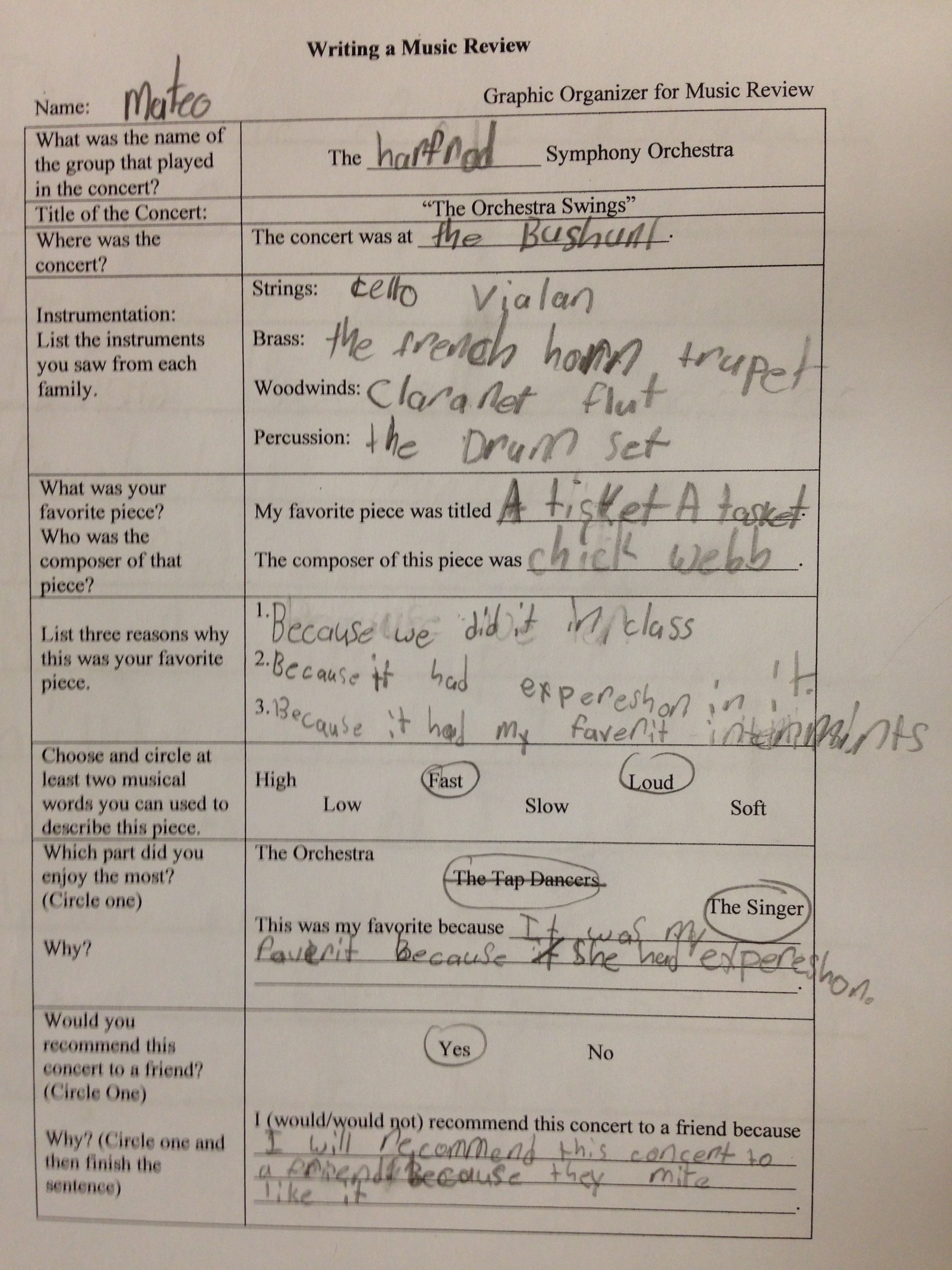 This could be of a concert attended, a piece performed in class, or one of their favorite pieces heard somewhere. This student filled out the graphic organizer then used it to write the essay. All the essays went on the bulletin board for all to read.