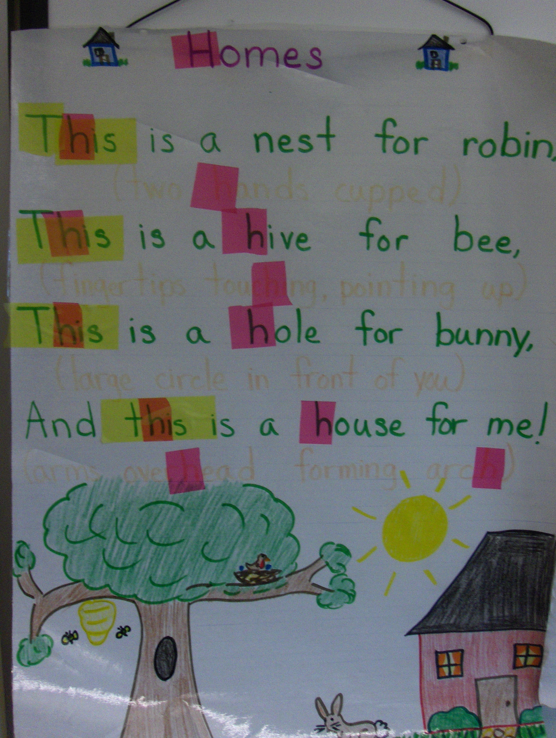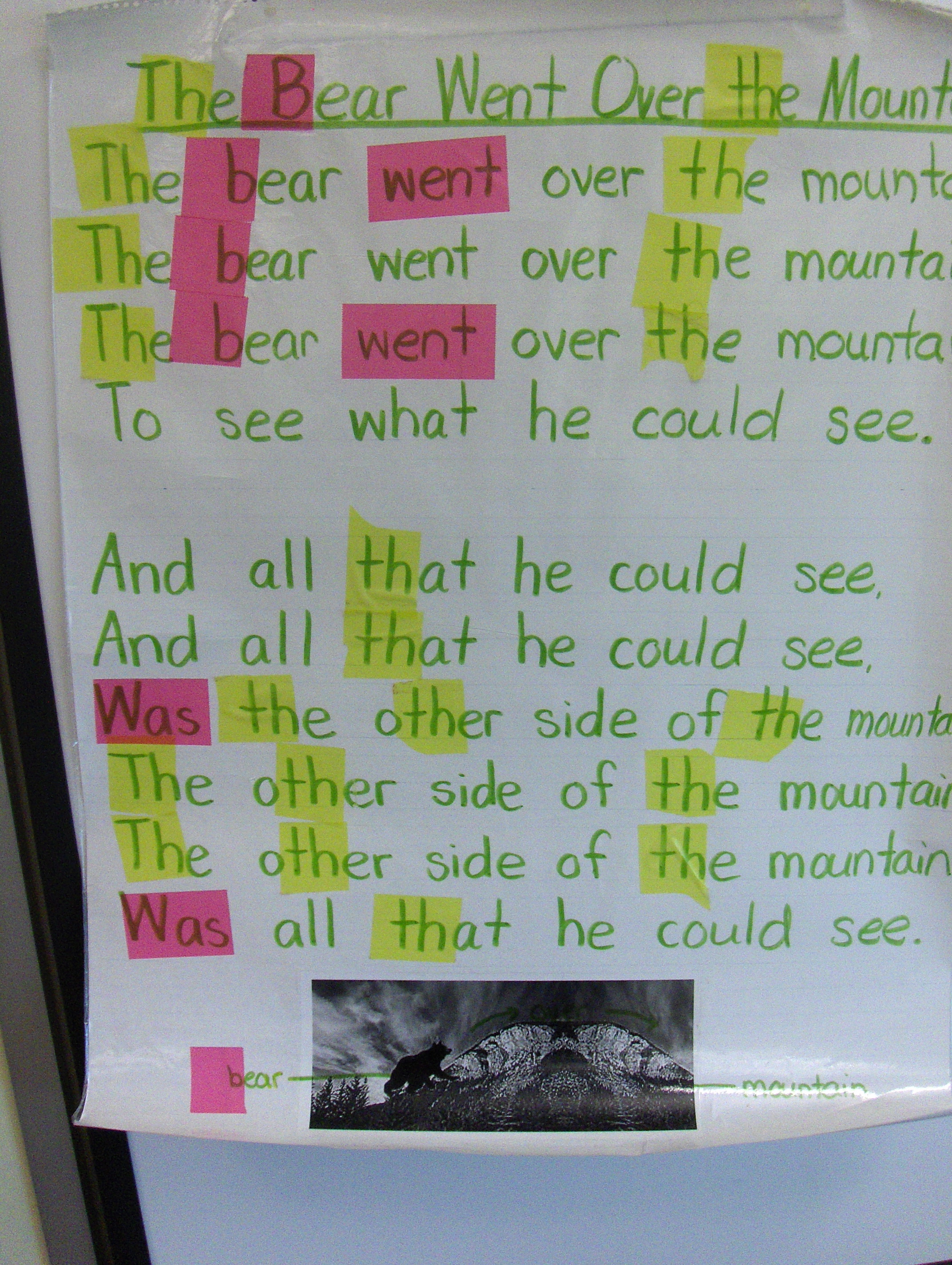 When I took a closer look at my other Ask Me notes, I realized how rich they were with material that could aid in Language Arts development, and not just Word Wall Words. Additional Language Arts learning drawn from Ask Me notes include Letter Recognition (upper case/lower case/location), Vowels and Consonants, Compound Words, Contractions, Quote Marks (differentiated speaking voice), Initial Blends, Ending Blends and Vowel Blends, Rhyming Words, Descriptive Language, Pictorial Representation, One-to-One Correspondence, and just plain Authentic Reading Material. Once I learned the components of the Language Arts curriculum from my classroom colleagues, I began to see connections in each and every Ask Me, and so did they. For example, in The Bear Went Over the Mountain, not only are there 29 “Detective” opportunities, but even though providing reading material was not my intent, I quickly learned that in the kindergarten classroom, it was used for exactly that. The very attributes that make this an easily accessible song to sing are the same attributes that make it easy to read; few words, familiar and repetitive.
