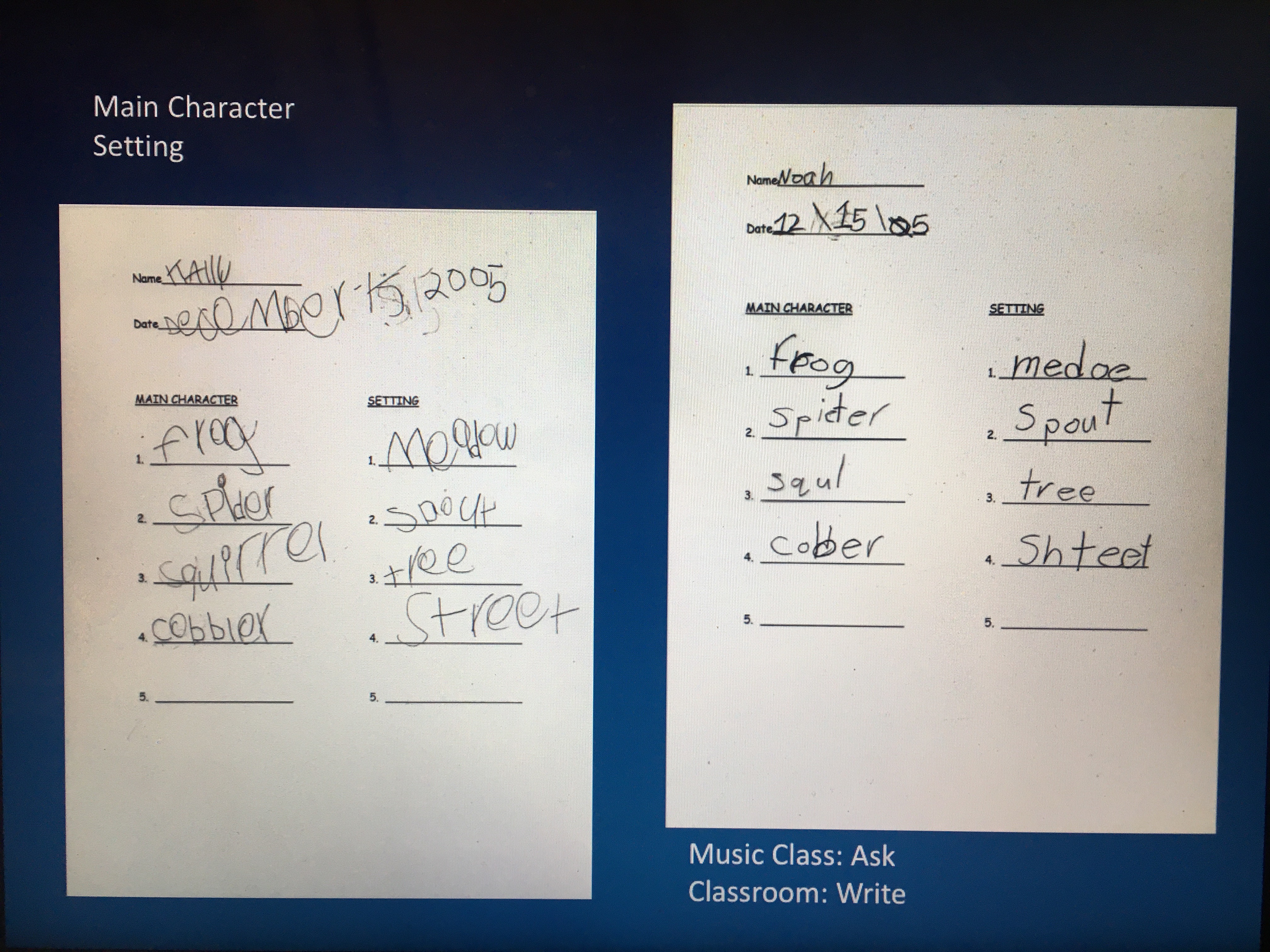 In the General Classroom, various worksheets are used, depending on what the classroom teacher is working on at the moment. Here is an example of Main Character/Setting. After the class sings/plays Frog in the Meadow in a circle, they rush to the worksheet on their desk and fill in the Main Character and Setting, then rush back to the circle for the next activity. Can you guess the other songs and chants?