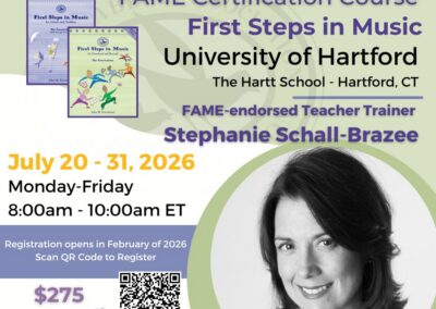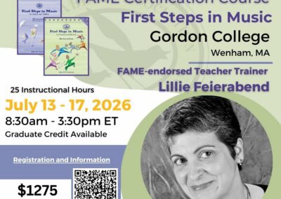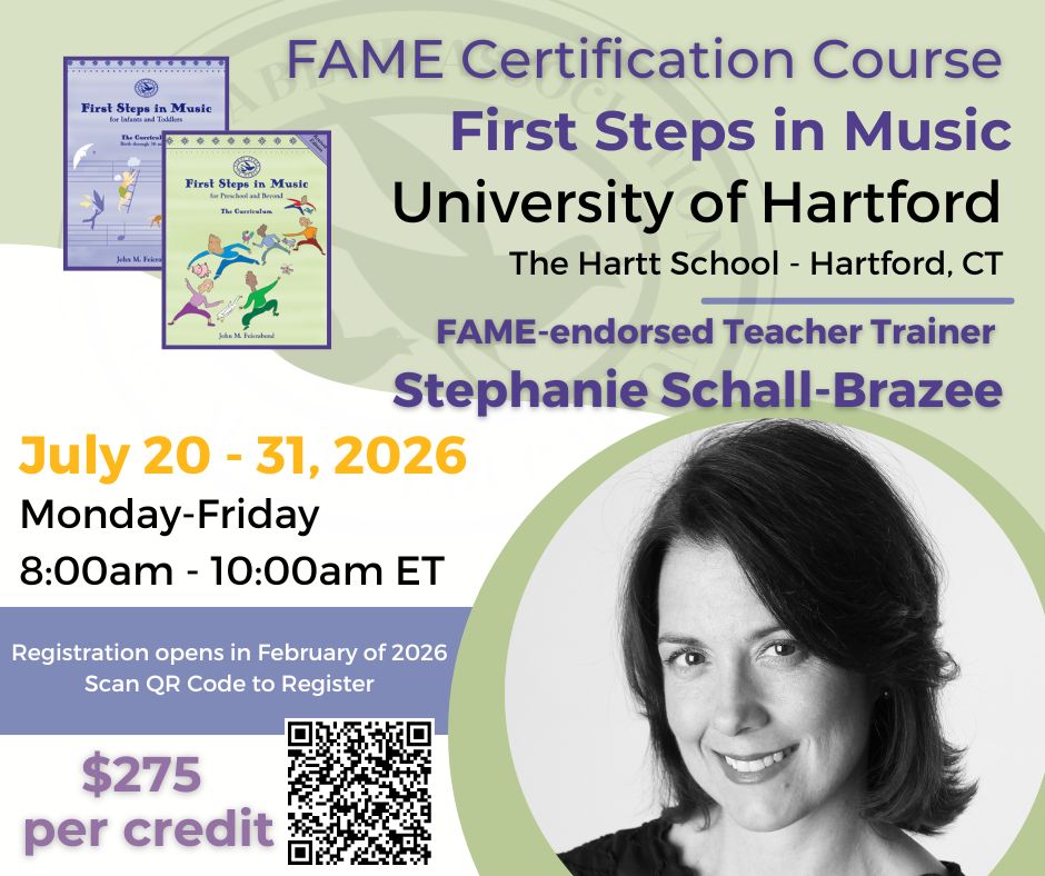 Upon successful completion of all three certification courses, you are considered fully certified in the Feierabend philosophy and approach. After three years of teaching following your last FAME certification course, you may apply to become a FAME-endorsed Teacher Trainer. For more information on applying to become a FAME-endorsed Teacher Trainer, please click here.
