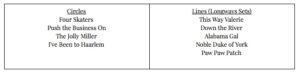 As Feierabend suggests in the Book of Song Dances, “…most students should be ready to explore these dances starting in second grade” (p. 5). In the classroom, teach play-parties in their original context and share pieces of their history. Some play-parties can be assimilated within a single lesson while others require scaffolding to ensure student success. For play-parties with new or unfamiliar figures, start small by teaching the dance figures in one lesson and review in the next. When students can move comfortably through the figures the teacher should then sing the accompanying song. All play-parties should be presented without accompaniment, as originally intended, and the students will eventually assimilate the song for their own. If students seem winded from the moving and singing it is appropriate to divide the class into movers and singers (Feierabend p. 5) as was the tradition at play-parties with onlookers singing for and with players. It is also important to remember the artful part of play-parties and to encourage musical expression while enjoying the game.
