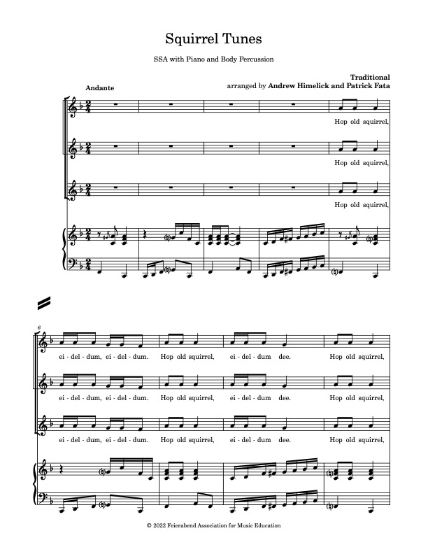 Squirrel Tunes, offered here by popular request, is an arrangement of the Feierabend fan-favorite songs about squirrels. It features a fun body percussion part and piano accompaniment. FAME Teacher Trainer Andy Himelick and Patrick Fata arranged it.