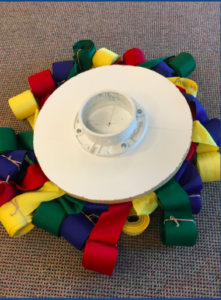 Everything comes apart quite easily for storage; the base is kept in a storage room, the pole leans against a wall in my classroom and a box holds the head with the ribbons and attached flange. Since I don’t want my ribbons to get wrinkled, I roll each ribbon into a spool, and secure it with a rubber band, ready for the next group of students, next year.