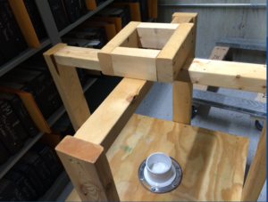 At one school, I slipped the PVC pipe over an old flagpole. At another school I put the PVC pipe over two badminton stanchions which fit perfectly! Then my good friends and colleagues at Gordon College created the base shown here. Rivet another 4” toilet flange at the bottom of your base for the other end of the PVC pipe and voila! Sturdy, and the pole will not rotate. Anchor the base with a few bags of sand, or a few flats of water or even a few cement blocks, if you have them. I then cover the base with red tablecloths and pots of flowers.