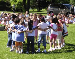 The PreK join us but do not dance; they bring juice boxes and crackers and have a great time watching the dances and being outdoors. One of my favorite memories is of three PreK students imitating some of the fourth-grade dance figures. This is the way children learn best, watching, imitating and experimenting.