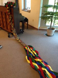 If you do plan on having a May Pole, here is it in a nutshell; you should have some sort of pole, somehow secured so it doesn’t fall over or rotate, and any even number of ribbons somehow attached at the top. The ribbons are woven by performing the Grand Right and Left around the May Pole. I am happy to share with you what I do. Make your decisions based on what works for you, your students and your situation. You will find that whatever you do will be joyous and wonderful and I guarantee everyone will have a great time.