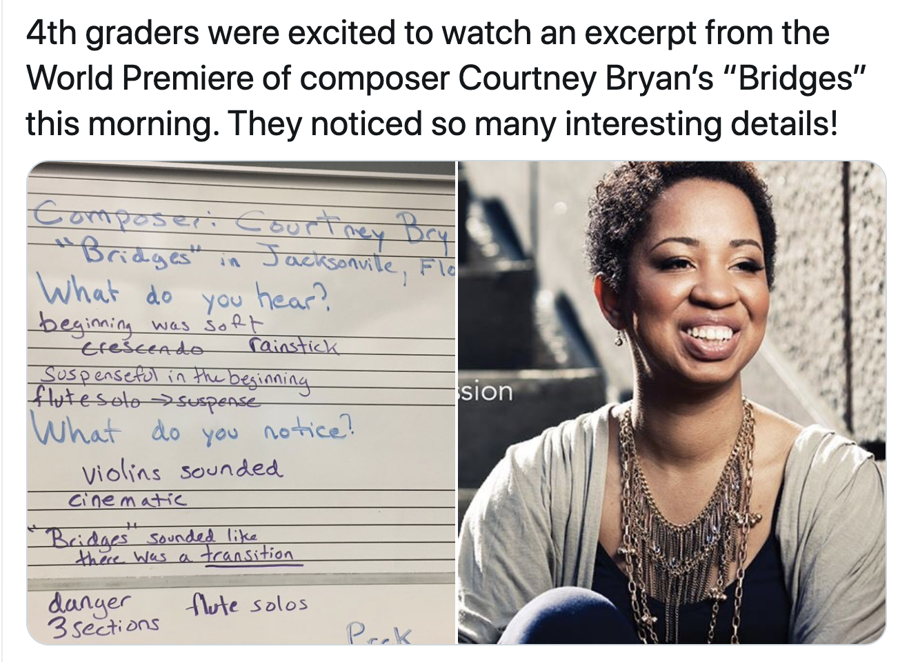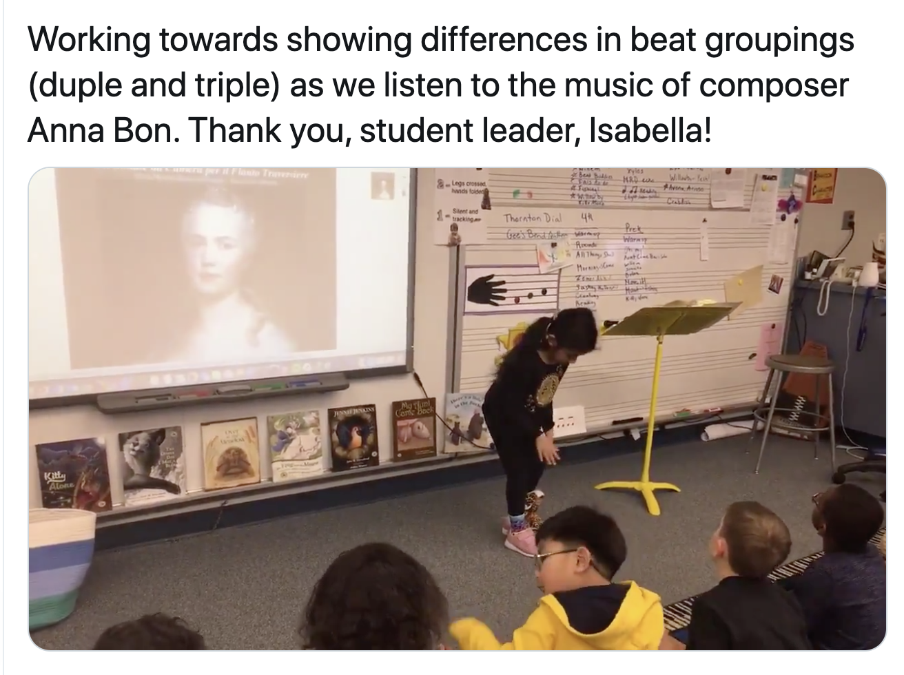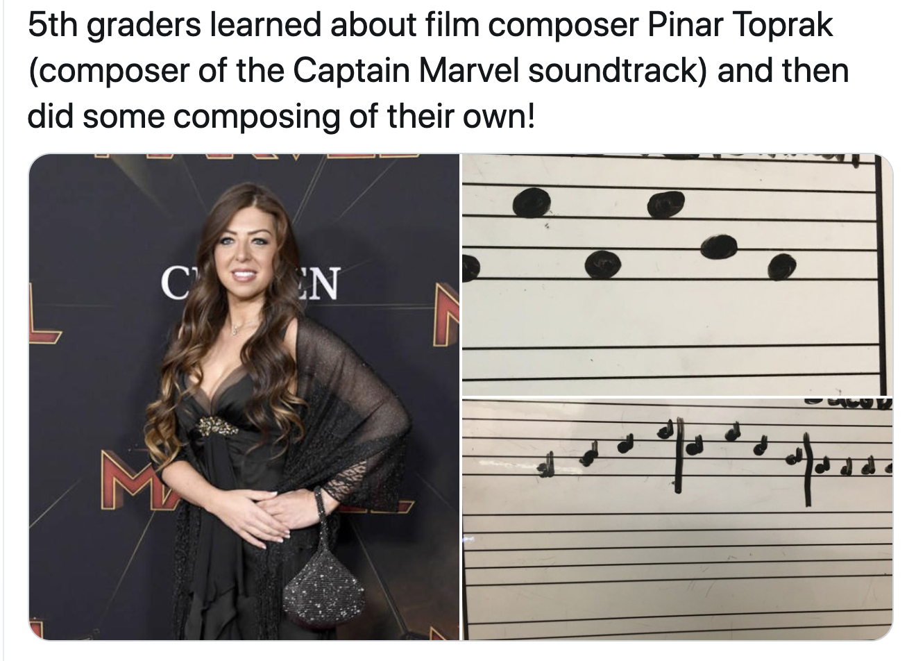 One day we might listen to an excerpt from Chicago Hip Hop artist Noname. Another time it might be Pinar Toprak’s “Captain Marvel” soundtrack or Fanny Mendelssohn’s seasonal “Das Jahr”. Once again, students have the opportunity to interact with a piece of music that is masterfully crafted and provides a mirror for those chronically underrepresented in music classrooms.